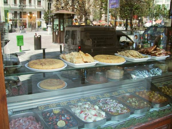 Typical Spanish food in window display w/ street reflection